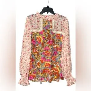 Romantic floral blouse with long sleeves. Beautiful lightweight flowy rayon fabric. So cute with denim. In excellent condition, I never wore her & she’s like new! Measurements: P2P 23-24”. Length 26” in front, & 29” back (high-low situation). Round neckline; button keyhole back. Long bubble sleeves with smocked cuffs.