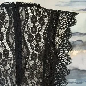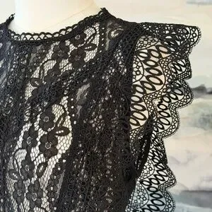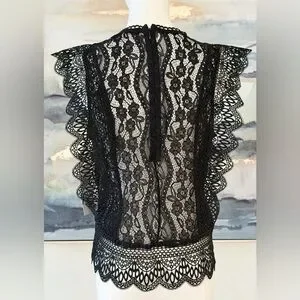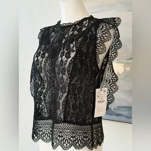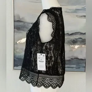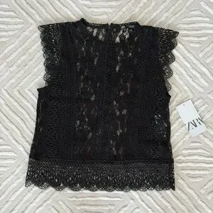 Gorgeous Zara black lace top. Crafted from delicate sheer floral lace with scalloped detailing and a flattering structured hem. High neckline and sleeveless design add a refined finish. Zip-back fastening. Unlined for an effortlessly elegant evening look.