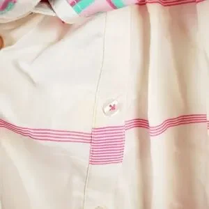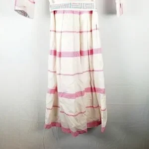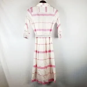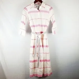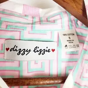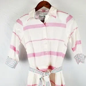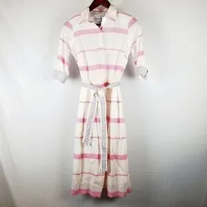 Dizzy Lizzie 50s style Mrs Maisel Dress. 100% cotton midi dress with stripes and geometric print detail. Button front. Tie belt. Collar. Sleeves can be cuffed or worn down. 1 minor yellow spot on front near buttons as shown in last picture, otherwise excellent condition. Size small.