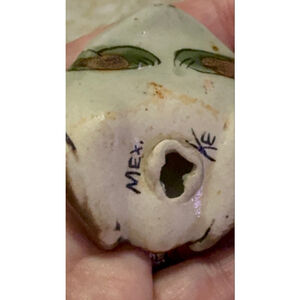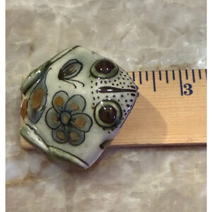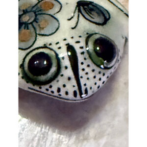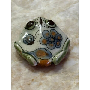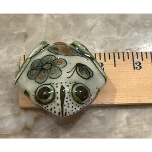 Pottery frog figurine, approximately 2.5 inches long as indicated by the ruler in the images. The figurine features a white base with green, blue, and brown painted details, including floral and butterfly motifs on its back, and dotted patterns around its eyes and snout. It has two dark, prominent eyes and a small hole on its underside, which is marked "MEX." and what appears to be a stylized "KE" for Ken Edwards. The ceramic has a glossy finish. No damage noted. Please see pictures for details measurements and lovely condition. I am accepting reasonable offers.
