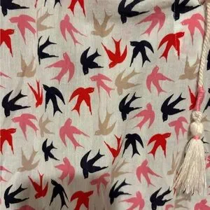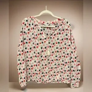 Lightweight Boden blouse featuring an allover swallow/bird print in pink, navy, red, and tan. Finished with a tassel tie neckline and long sleeves — perfect for spring, work, or casual wear.