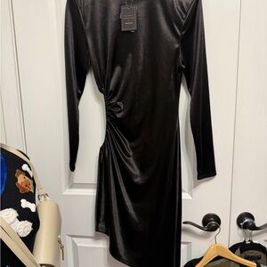 Elegant black dress with asymmetrical design. Features a stylish side cut-out. Long sleeves add sophistication.