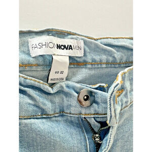 These FashionNOVA men's jeans are a size 32 with a regular fit and straight style. They are made of distressed denim in a blue color. Great Condition and on trend.