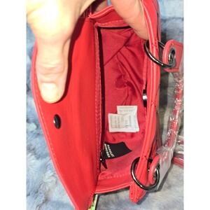 A red quilted small handle tote bag with studs. Features a prominent black logo on the front and a top handle. The bag includes a detachable strap for versatile wear and a secure snap closure. Interior features a lined compartment. The original tag with MSRP is still attached.