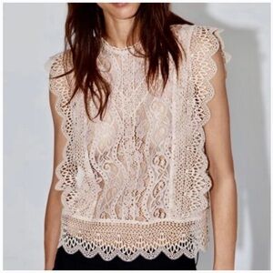 Gorgeous Zara Blush Pink lace top. Crafted from delicate sheer floral lace with scalloped detailing and a flattering structured hem. High neckline and sleeveless design add a refined finish. Zip-back fastening. Unlined for an effortlessly elegant evening look.