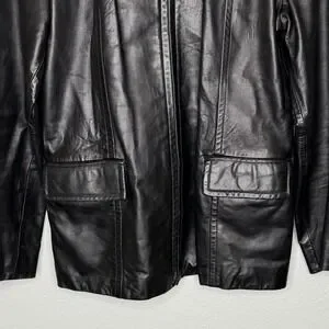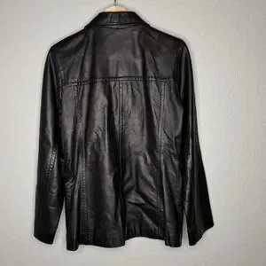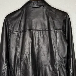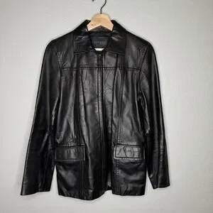 Sleek black genuine leather jacket by Express with a clean zip-front design and structured, minimalist silhouette. This piece channels early-2000s Y2K style with a subtle moto influence, perfect for downtown chic, quiet luxury, and modern old money aesthetics.