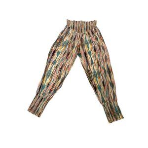 Crafted from premium 100% cotton, these Misa Los Angeles Vega Jogging Pants feature a versatile multi-color blurred ikat pattern. The elastic waistband and cuffs offer a tailored yet comfortable fit, ideal for casual settings. Stylishly designed with a blend of cream, green, and purple tones for a sophisticated look. Shop matching bandeau top in my store sold separately.