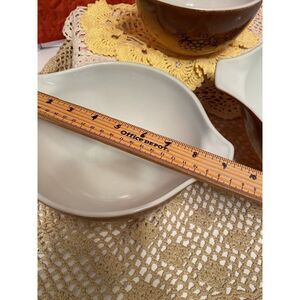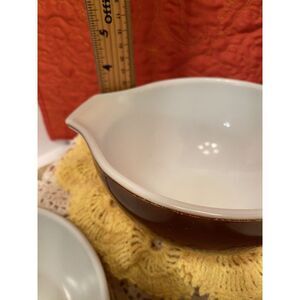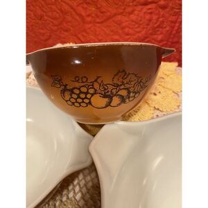 Add some vintage charm to your kitchen with this 1960s Pyrex Cinderella Mixing Bowl Set. The set includes three pieces - 4qt, 2.5qt, and 1.5qt bowls - all in a beautiful brown color with an ombre and orchard theme for the small bowl. The round shape of the bowls makes them perfect for mixing and measuring ingredients for all occasions.