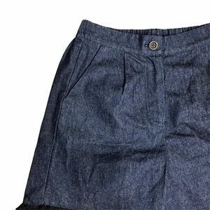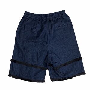 Features: Bermuda style, back elasticized waist, zipper and button closure, non functional back welt pockets, denim contraction, tiered black fringe detail gives these shorts a chic, trendy look, statement