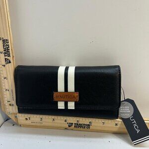 This Nautica long wallet clutch features a sleek black exterior with white stripe detail and front Nautica logo patch. The wallet includes RFID blocking protection for added security and multiple interior card slots bill compartments and clear ID windows along with a zippered coin pocket. Snap closures keep contents secure and the layout offers excellent organization for everyday use or travel. Item is new with original tags attached and made in China. Clean interior and exterior as shown in photos.