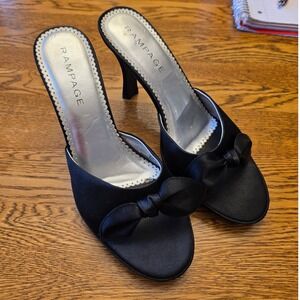 Keywords: satin heels, mule sandals, bow detail, evening shoes, formal footwear, party shoes cocktail, black satin mules, stiletto heels, open toe sandals, y2k aesthetic, glam style, rampage shoes