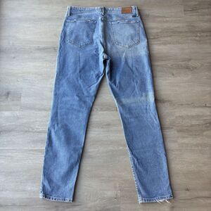 authentic Lucky Brand Brooke Skinny jeans, size 10/30. These jeans feature premium Cone Denim, a hallmark of quality and durability. They boast a fashionable medium wash with a cool, natural fade and subtle distressed details, including a faded area on the back of the leg, giving them a perfectly worn-in, vintage aesthetic. The Brooke cut is designed for a slim, flattering skinny fit. The size tag confirms the size is 10 and the inseam is 30( measured 29)