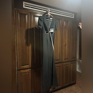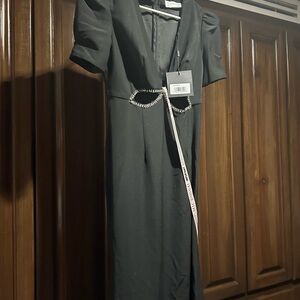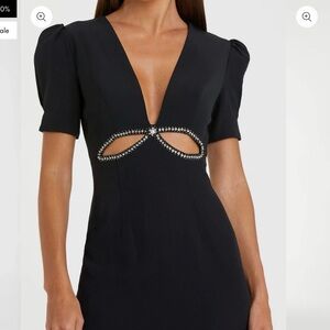 Chic black midi dress with cutout detail. Features short sleeves and a deep V-neckline. Perfect for elegant occasions.