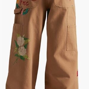 These pants are the Free People Bright Time Embroidered High Waist Wide Leg Pants, which feature artisan-inspired embroidery on durable canvas