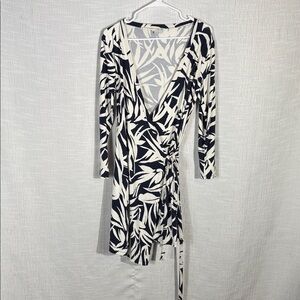 Comfy breathable cotton dress in navy and off white abstract palm leaf print; true/real wrap dress with full length sleeves.