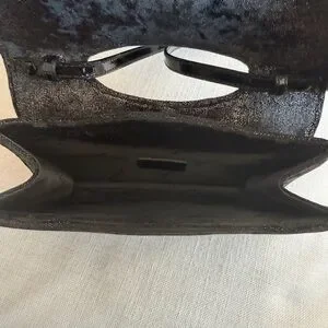 Includes a removable black patent leather strap. Can be worn on the shoulder or carried as a clutch.
