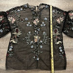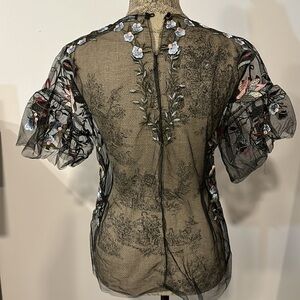 Zara black sheer mesh embroidered flutter sleeve top with keyhole neck size XS