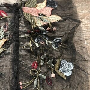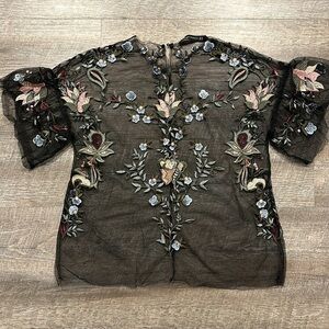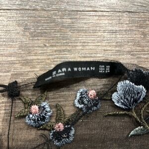 Zara black sheer mesh embroidered flutter sleeve top with keyhole neck. Black with pink, green, blue embroidered floral detail, gently pre-loved condition. size XS