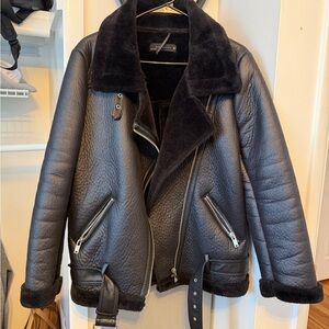 Zara Black Leather Jacket with Shearling Collar