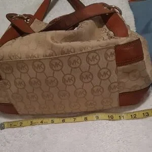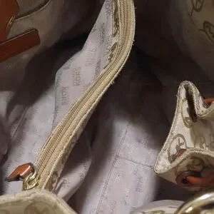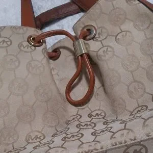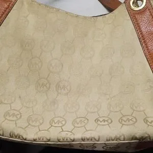Michael Kors shoulder bag in cream and brown. Features signature logo pattern and stylish leather accents