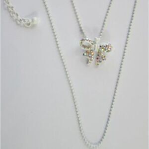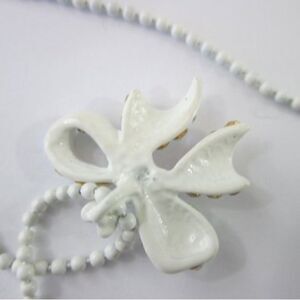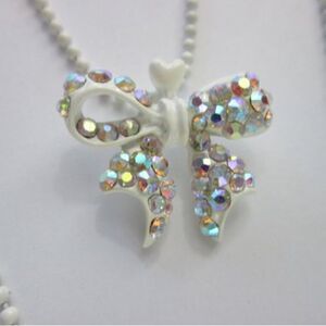White enameled necklace with ball chain, bow pendant & AB iridescent crystals. White coated base metal with lobster claw clasp and 2 in extender.