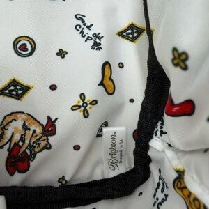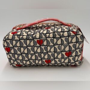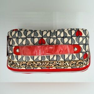 Brighton Wild Love cosmetic bag features a heart and leopard print pattern, red trim, a top handle. Never used.