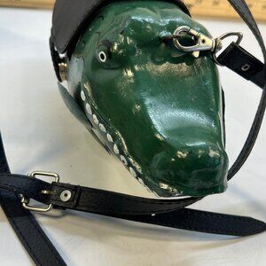 Unique vintage alligator shaped handbag crafted in green with a playful crocodile design. Features a structured novelty body with painted details, secure top opening, and an attached leather strap for shoulder or hand carry. A standout collectible purse ideal for vintage fashion lovers, themed outfits, or statement accessory use. Shows normal wear consistent with age as visible in photos, adding character and charm. Measurements are shown in images for accurate sizing.