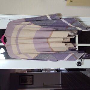 Stylish lavender, camel, and navy tones. Features fringe detailing. One Size. New, never worn.