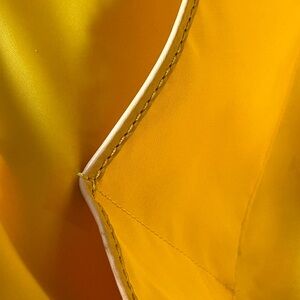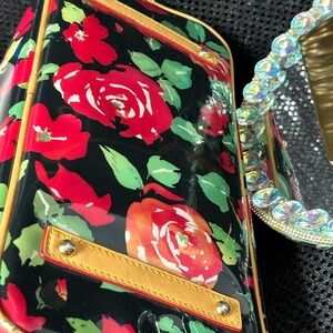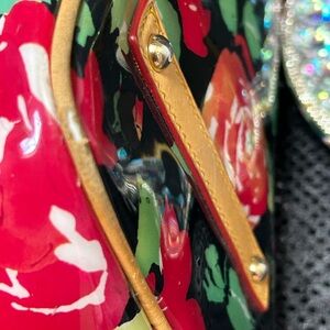 Elegant tote with vibrant floral pattern. Features red and green flowers on a black background. Stylish and eye-catching design. Beautiful yellow interior. There are 2 scratches on the bag but they are difficult to see. They blend in with the flowers. There is a 10” drop on the double straps. Also minimal rubbing on one of the corners.