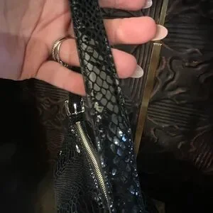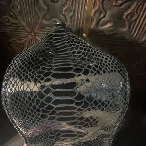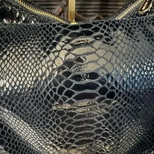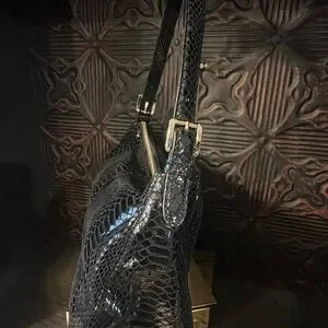 Material: The bag features a black faux snakeskin or python-embossed leather exterior.