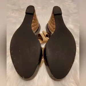 Camel wedge slip on sandals. Nice for Spring and Summer. Jute wrapped heel. These shoes offer comfort with the elastic straps.