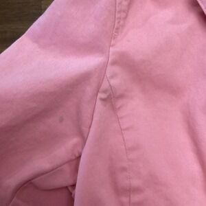 Flaw see pic spot on arm. Talbots Stretch blazer in a vibrant coral pink hue, crafted from a comfortable cotton-blend twill with a hint of Lycra for the perfect fit. This classic three-button jacket features a notched lapel, front flap pockets, and elegant four-button detailing at the cuffs. The interior is partially lined with a charming pink and white pinstripe fabric, adding a polished touch to this versatile piece.