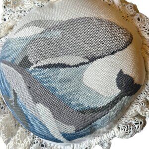 This round pillow features a detailed cross stitched whale motif, making it a refined accessory for nautical-themed decor. The removable insert allows for easy maintenance, while the ruffled and crochet trim adds a classic touch. Its 16-inch diameter provides substantial support and comfort, ideal for enhancing any seating arrangement.