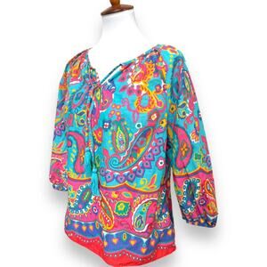 🍀Talbots Colorful Paisley Cotton Blouse Tassel Neck Boho Lightweight Size Small