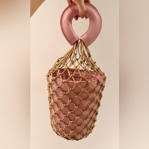 In excellent condition. Comes without dust bag. Stylish and unique, this pink and tan woven bucket bag is perfect for any occasion. The intricate design adds a touch of elegance to your outfit.