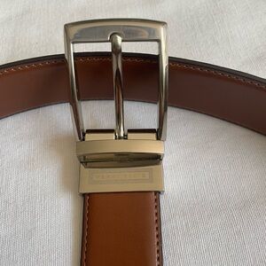 Tan reversible belt with a stitched edge; shiny prong buckle with brand name on the bottom.
