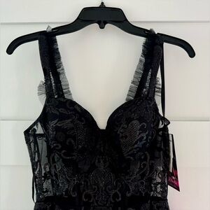 Chic black dress with floral lace overlay. Perfect for evening event.