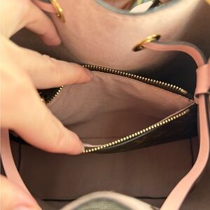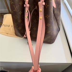Excellent condition Louis Vuitton Neonoe MM with rose pink accents. Comes with the dust bag. There is a little bit of creasing in the adjustable strap (shown in photos), other than that, this bag is in excellent condition!