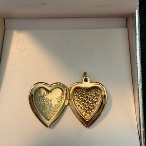 Elegant gold heart locket pendant with intricate floral design. Perfect for adding a touch of sophistication to any outfit.