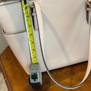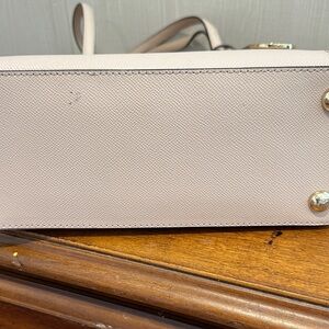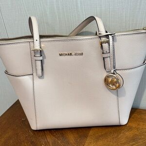 Chic Michael Kors tote in light beige. Features gold-tone accents and spacious interior. Ideal for everyday use. USED… has minor stains on front, side pocket, and bottom of the purse. Please view photos. UNBRANDED dust bag included.