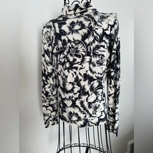 Elevate your style with this chic 77% silk floral sweater. Featuring a striking black and white design, it's perfect for any occasion. Add a touch of elegance to your wardrobe. Very good used condition. No stains or defects. Pet free, smoke free home.