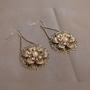 These elegant gold floral earrings feature intricate detailing and a classic design. Perfect for adding a touch of sophistication to any outfit.