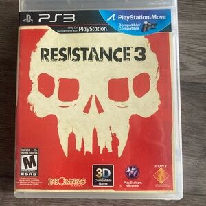 Engage in intense battles with Resistance 3 on PS3. Bold red and white design. Experience immersive gameplay.
