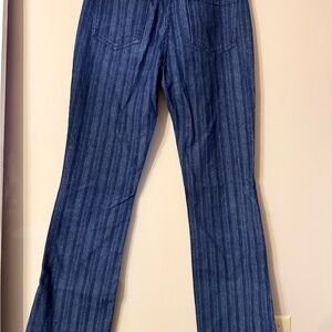 Chic dark blue jeans with subtle stripes. Flare design for a trendy look. Ideal for casual wear. Only worn once.