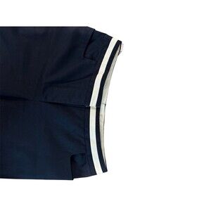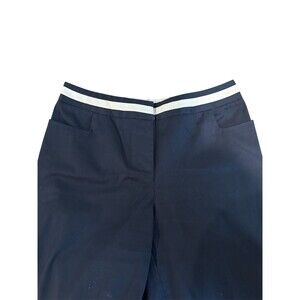 Talbots navy blue dress pants that make getting ready for work feel effortless. The mid-rise, flat-front fit smooths through the waist, then falls into a clean straight leg for a polished, classic look. A crisp white striped waistband adds a subtle pop, while side pockets and back flap pockets with gold buttons keep it practical and sharp. Zip with hook-and-bar closure. Size 10, approx. 32” waist, 30” inseam. Condition: pre-owned.