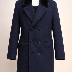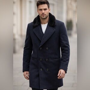 Men's Elegant Navy Pea Coat with Black Fur Collar