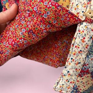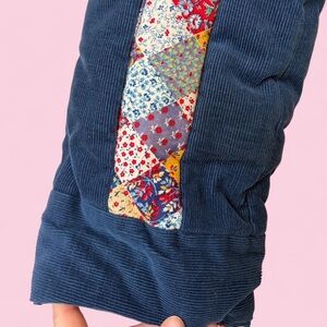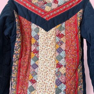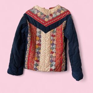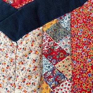 Sumptuous colors and textures on this one of a kind piece. Patchwork quilted corduroy jacket; handmade with chevrons and stripes in red/blues/yellows calicos; florals and navy blue soft corduroy. Elevated boho luxury.