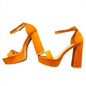 Elevate your style with these bold platform sandals featuring a chunky block heel and secure ankle strap. Crafted in a striking camel faux suede, these shoes add a statement touch to any ensemble, providing both height and confidence with their substantial platform and comfortable design.