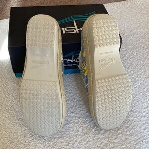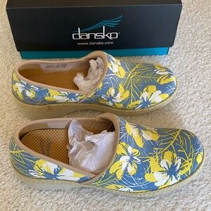 Chic Dansko clogs with a floral design. Features blue and yellow hues. Dansko Sz 39 Victoria Hawaiian Hibiscus Floral Yellow Blue Slip On Clogs Approximate US size 8. Brand new in box never worn. Item comes from my smoke free and pet free home.