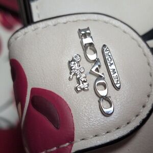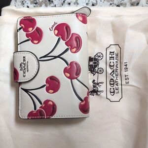 Coach Cherry Hamptons Hobo Shoulder Bag And Wallet Set. (Be sure to click See More for all details). This set has been carried ONCE and is in perfect condition. Super cute, highly popular Coach cherry print on the classic Hamptons Hobo bag in soft Glovetanned Leather with zipper top and dog leash clasp and adjustable shoulder strap drop. Comes with the Coach Corner Zip Medium Wallet. Colors are a bright cherry red perfect for spring and Chalk (an ivory/off white). Both the logo hangtag and blank tags are intact (you can have it personally monogrammed at any Coach retail store). It also comes with a satin Coach dust bag (may differ from shown but is a genuine Coach dustbag). (Note: the Coach Cherry Charm is a styling prop and is NOT included).